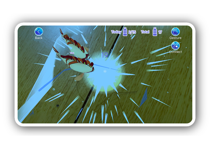 A fast-paced 90-second match where 2–4 players compete in a shared AR domain to collect bottles as quickly as possible. After a brief 30-second matchmaking period, players control their fish in real time, racing to gather dynamically respawning bottles. Final rankings and collection totals appear at the end of each round for a competitive, social gameplay experience.